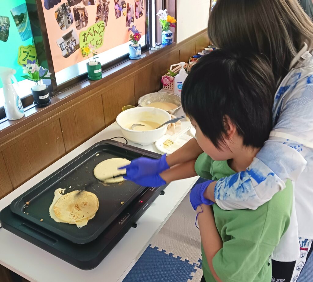 調理体験ではホットケーキ作りを行いました。火傷に注意して職員と一緒にホットプレートに生地を流しいれてひっくり返しております。
