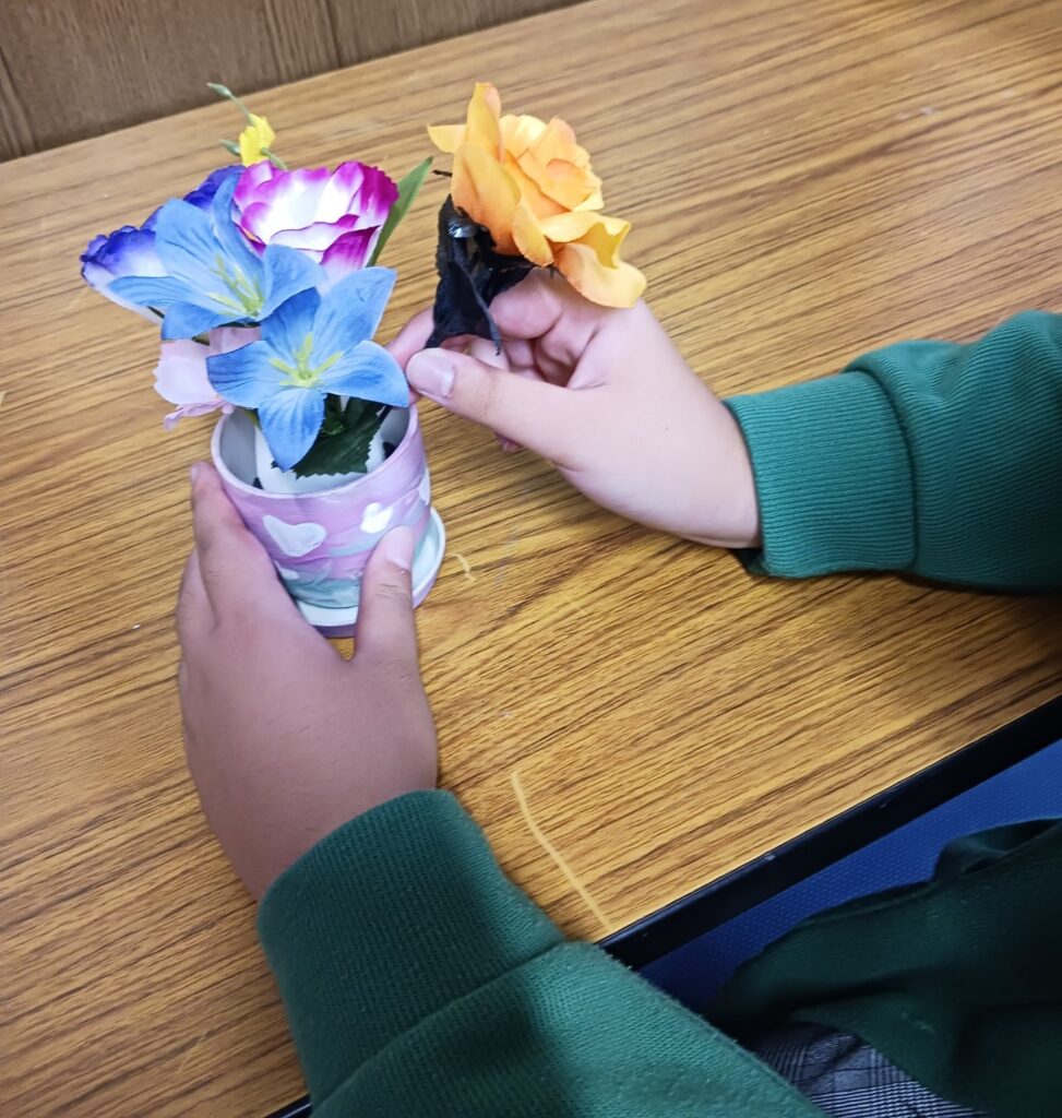 工作では植木鉢に好きな色を塗ったり模様を描いたりして、好きなお花を活けております。色や大きさのバランスを考えながら皆さま集中して取り組むことが出来ました。