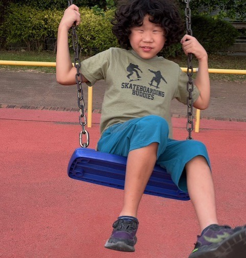最初はブランコが漕げずに職員に押してもらっておりましたが、職員が足を「曲げてー、伸ばしてー」と声をかけると漕げるようになって笑顔で遊んでおります。